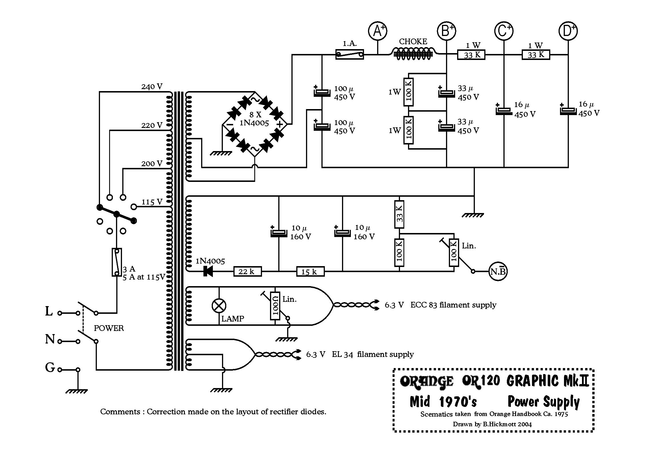 | Graphic post'74 schematic | NOTE: The rectifier diodes in this schematic are drawn incorrectly. If you are building a clone or refurbishing an amp from this schematic, please follow the rectifier bridge section of one of the other 1970s schematics. | |